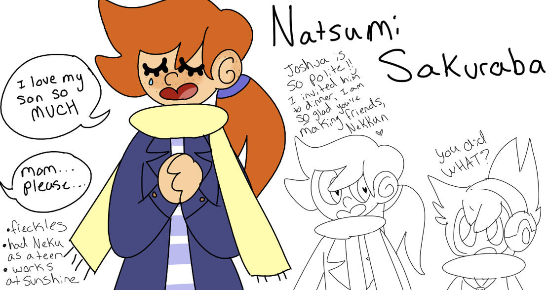 Natsumi gave birth to Neku when she was sixteen, and dropped out of high school to take care of him. Neku’s father was an older man that dropped in and out for a while, but eventually left for good when Neku was around two, as he was never really interested in raising Neku and was only interested in pursuing a relationship with Natsumi. It was a rather abusive relationship to begin with, and Natsumi was relieved to finally be rid of him. It was hard for her to explain to Neku that his father left because he was a bad person, and not because there was anything wrong with Neku, and she often worries that Neku still doesn;t understand that to this day.She continued to work at Sunshine once Neku was born, and often took him into work with her, sneaking him extra chicken nuggets every once in a while which is, evidently, why chicken nuggets from Sunshine are one of Neku’s favourite foods. Since then, she’s hopped around between other jobs, but most of them are very hard for her to hold.She and Neku live in a pretty small apartment. They don’t have the most money, but they make do, and Natsumi splurges on art supplies for Neku quite often. She adores her son and is immensely proud of him as an artist, as she always has been. There are a few drawings from when Neku was a child still taped to the fridge. Her son is incredibly embarrassed by this, and covers them with exams whenever friends come over, much to their confusion. (Neku, why did your mom hang this math exam on the fridge? You got a C.)Natsumi was the only person Neku was able to be open with for the longest time. She’s his best friend, and for a good portion of his life, she was his only friend. She’s so incredibly happy that Neku has begun to make and interact with friends. She wants the very best for him, and she’s thrilled to see him so happy.During Neku’s first week in the Game, Neku saw her placing flowers in front of the Udagawa mural once or twice only to get yelled at by a shop owner, saying that she couldn’t place them there. Yet, she went back every day to try again, despite the result being no different and her flowers winding up in a dumpster every day. Neku didn’t understand why this woman kept trying, rolling his eyes at her attempts. It would have been easier just to give it up. However, when he got his memories back, it hit him that she’d been leaving flowers for him, and once Week 3 was over, the first thing he did once being released from the hospital was run to hug his mother and tell her how much he loved her.Natsumi has a crush on Hanekoma and Neku is horribly embarrassed by this. Another thing Neku’s embarrassed by is the fact that his mom calls him ‘Nekkun’ as a nickname. He’s gotten her to stop doing it in company of others, but she still uses it when alone with him at home quite a lot.